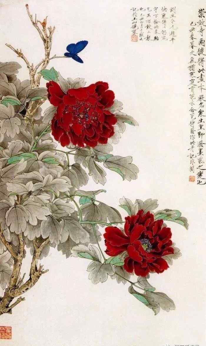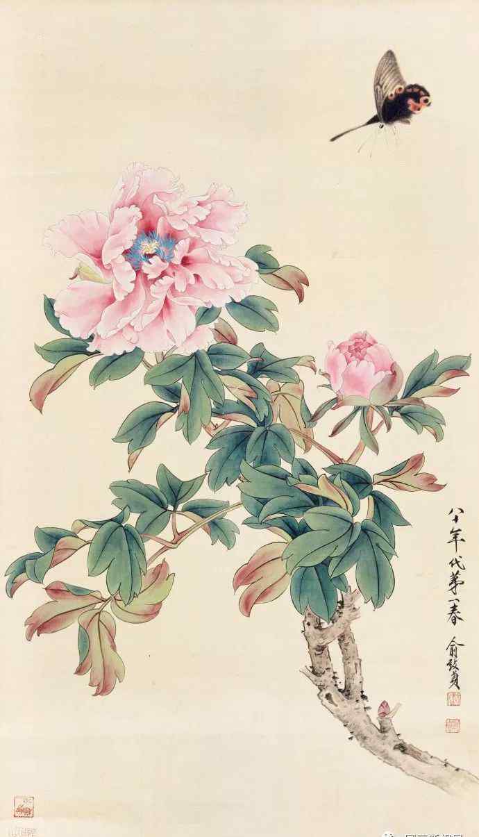 的工笔花鸟和书法受宗的影响较大,但他在继承古典传统的同时,又十分重视写生。画中描绘的牡丹花、蝴蝶形象细致含蓄,从茎、枝、叶到花头的线条严谨细腻,力度相当强;蝴蝶、枝叶的墨汁与花头的红色形成对比,丰富、优雅、有装饰性。