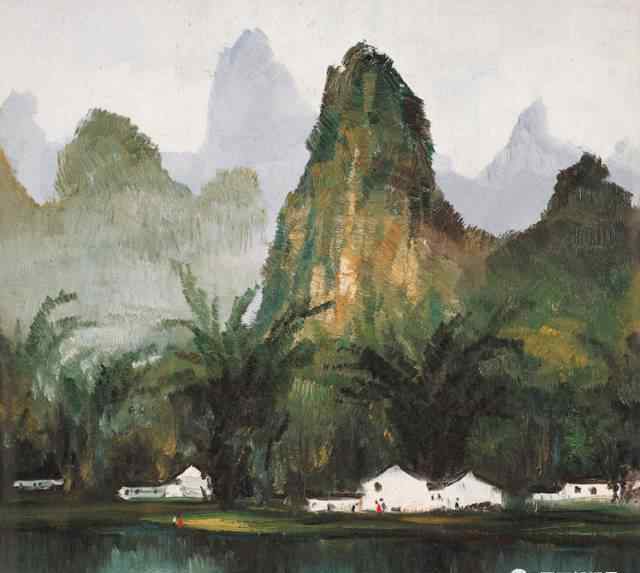 漓江的美在于山水的变化,在于群山环抱,竹林掩映的宁静。在《漓江畔》的作品中,画家展现了桂林独特的山形,同样的山水,细腻的美。远处,茂密的绿地是一片竹林,河岸上有低矮的房屋,沿着河岸形成一条线形的构图。