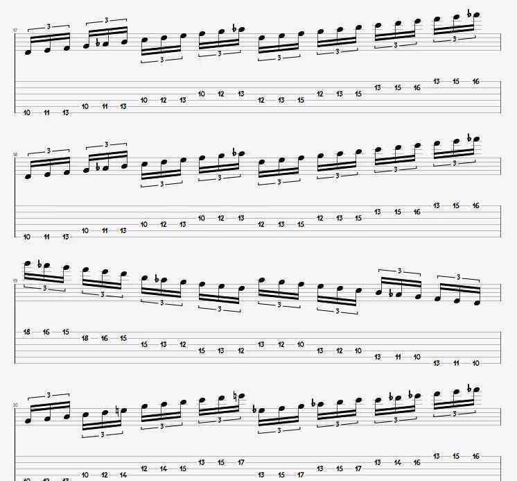 下面是“速玩+扫拨”的另一段。虽然扫掠部分的和弦相对简单,但快速弹奏部分的音阶选择发生了变化: