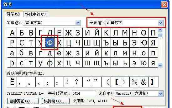 当子集被剪切成西里尔文时,你会看到ф符号,并在选择后插入它。