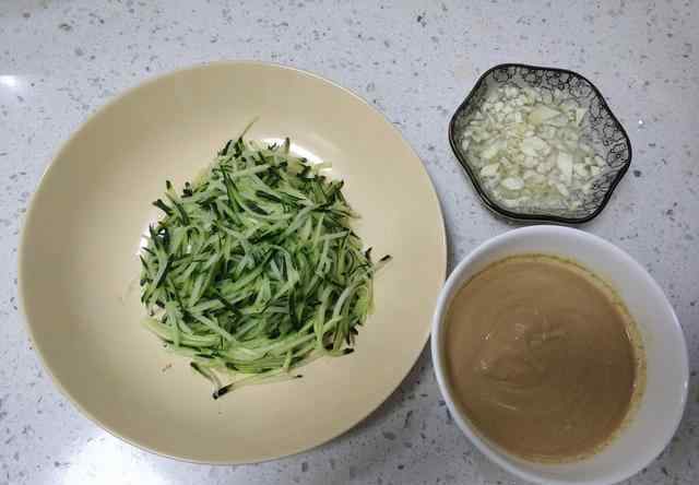 3.接下来用丝擦把黄瓜擦成细丝,把大蒜剁成蒜末,加不到清水做成蒜水备用。加入适量清水稀释芝麻酱,搅拌均匀备用。
