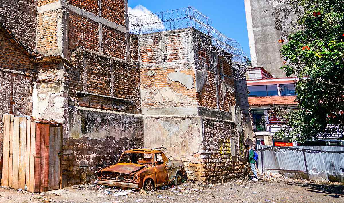 有时候不知不觉就走进了贫民区。一开始看到一辆巡逻警车,我就大胆地走在警车后面,进入了贫民区。警车到了某个路段,车上的警察下了车,举枪警戒警车两侧,两边都是烧黑痕迹的平房。过了这一段路,警察迅速上车,车子快速驶过。问题是我跟不上警车。看着两边当地居民异样的眼神,感觉情况不太好。我赶紧唱了一首小曲,假装淡定,迅速退出原路。