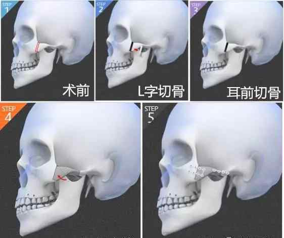 颧弓推进手术流程:切除颧弓两侧部分,再推回去,用钛钉固定。