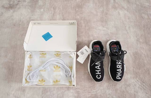 说是设计,其实和 LV 与 Supreme 联名一样,也只是属于单纯的logo 叠加,Adidas Originals NMD 的鞋型,Chanel 黑白配色,左脚写着 Pharrell,右脚写着 CHANEL 。