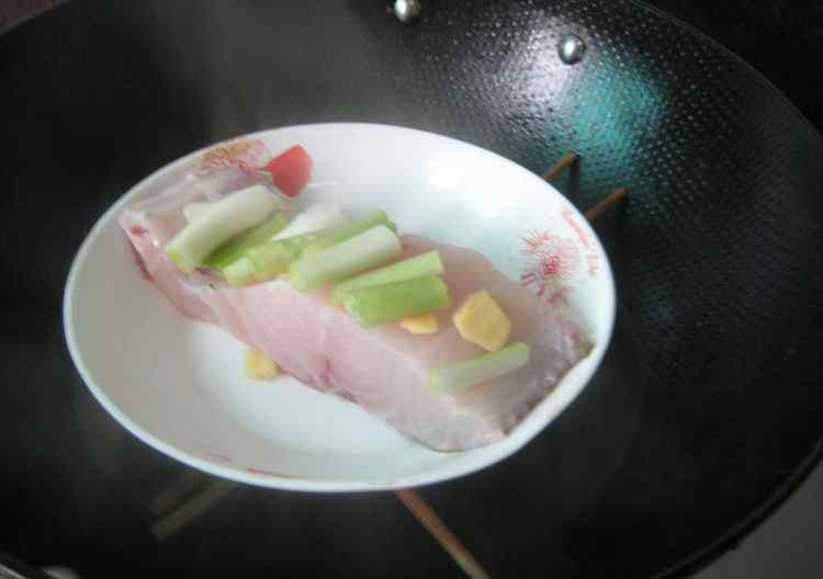 5 放上鱼段,鱼段上放上葱白段和姜片