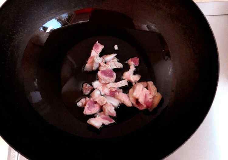 2 热锅放油,放入五花肉片翻炒