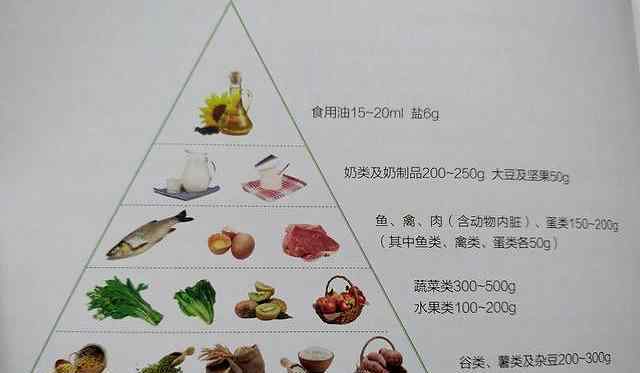 谷物(如稻米、小米手机、黑豆)、甘薯(例如地瓜)以及杂豆(如小红豆、黑豆、大黑豆等) 300-400g(粗粮不少于20%),蔬菜400-500g(青菜占2/3),新鲜水果200-400g, 鱼类蛋家禽类200-250g,牛乳300-500g,黄豆及干果40-60g,植物油20g,盐6g。