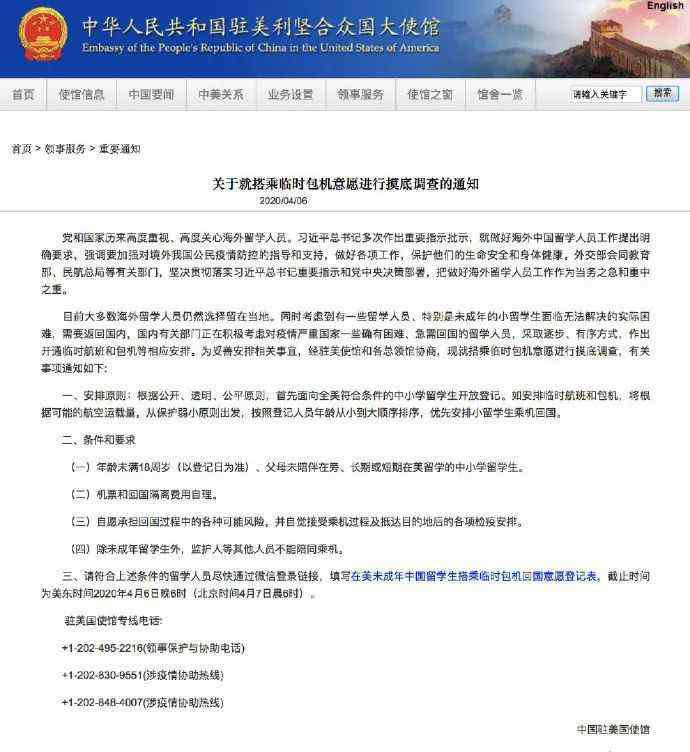 驻美使馆就搭乘临时包机意愿进行摸底:明确优先安排小留学生乘机