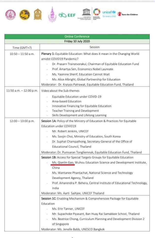 原来,这是一场由联合国教科文组织发起的国际视频研讨会“世界公平教育国际研讨会:2020一切为了教育 / The International Conference on Equitable Education:all for Education 2020”。参与会议的人员是来自全球180多个国家和地区的研究学者,他们在网络上共同探讨城市应对新冠病毒的经验。高老师作为一名深入参与线上教学的研究者向他们介绍武侯区应对疫情的一系列确保教育公平和教育质量的做法和经验。