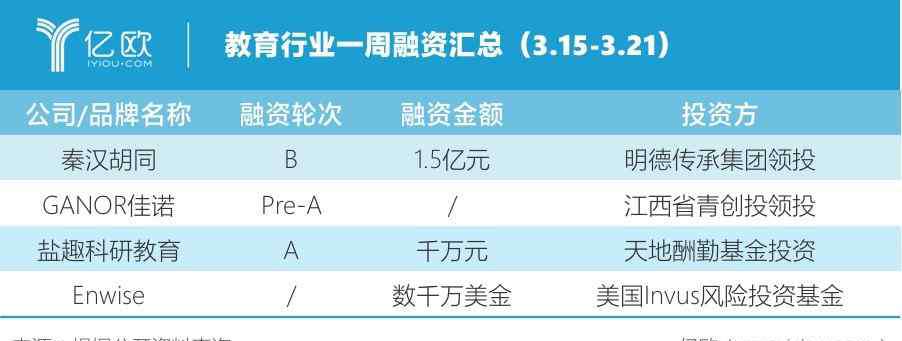 在过去一周里,教育领域国内3家企业获得融资,值得注意的是,国学教育品牌秦汉胡同获得B轮1.5亿元融资;此外据路透社报道,在线教育平台猿辅导接近获得新一轮融资。