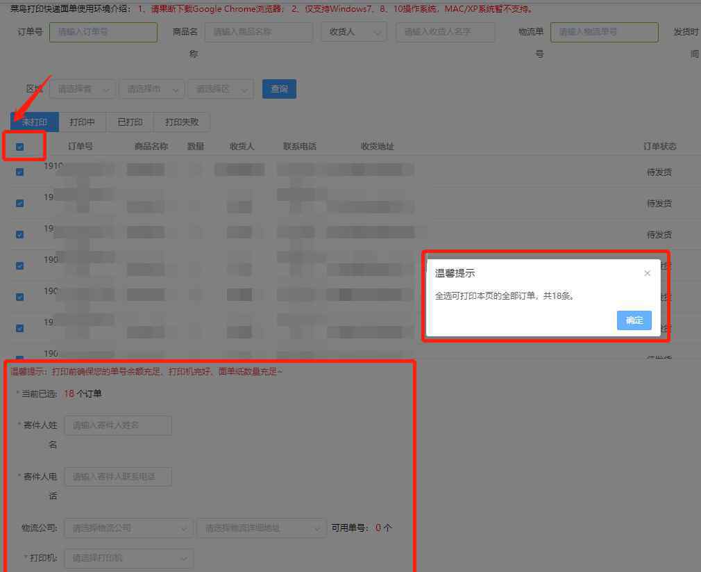 2.默认情况下,系统会为您筛选出“待发货+无权利保护”的订单,勾选下面的复选框,选择当前所有待发货的订单,系统会弹出提示订单数量的页面,方便您查看。然后在下方填写您的发件人信息,选择快递公司和打印机,点击【开始打印】自动打印面单(如下图2)!