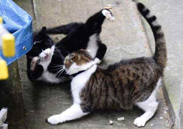 英国《太阳报》记者近日拍到两只猫在官邸附近打架。帕默斯顿攻击拉里,并咬了他的脸。然后他飞快地打了拉里一拳,拉里的领结在打斗中被扯掉了。然而,拉里不是一个游手好闲的人,立即发起了猛烈的反击。
