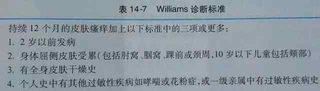 4.免疫状态:血清IgE水平升高,外周血嗜酸性粒细胞增多。诊断大多采用威廉姆斯在1994年制定的标准: