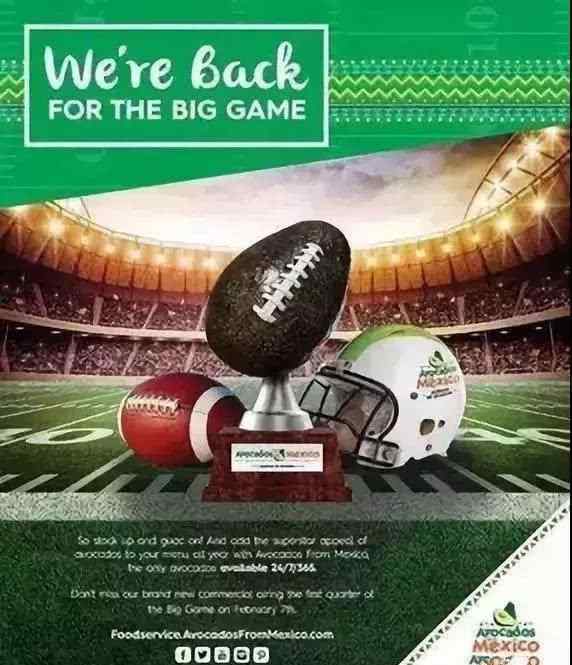 甚至将牛油果直接纳入足球队员的日常健康饮食,不断向人们传达牛油果是健康食品,牛油果是观看超级碗期间最适合的零食的观点。