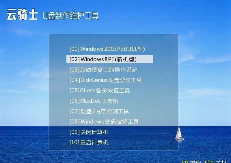6.重启电脑,开机画面出现时按快捷键进入云骑士主菜单界面,上下键选择[02] Windows 8 PE(新款),回车进入PE系统