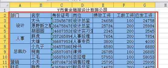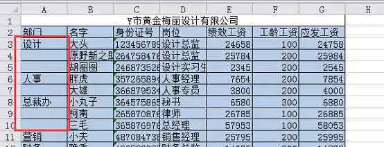 经分析,此时A3-A10区域看似合并,但实际上此时是假合并(只有格式和大小是合并样式),仍可进行过滤操作。前面的步骤讲了筛选的操作方法,这里就不赘述了。筛选出设计部门的结果如下。此外,我们还可以分别选择人事部和总统办公室。