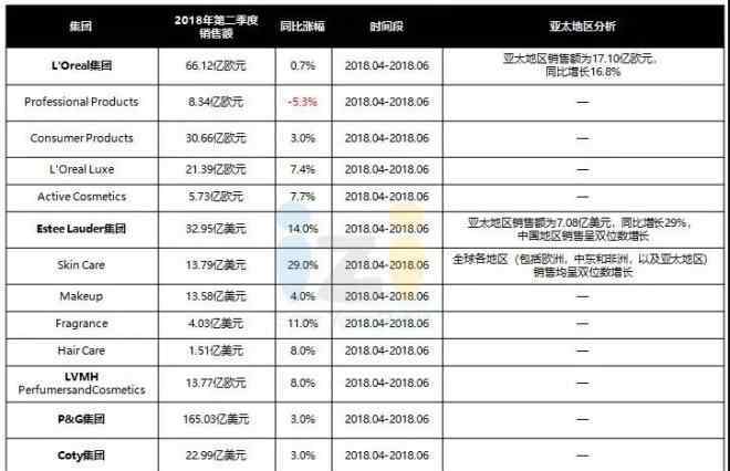 2018年第二季度,接受调查的七大化妆品集团业绩均有所提升,其中雅诗兰黛集团和爱茉莉太平洋集团均出现两位数增长。