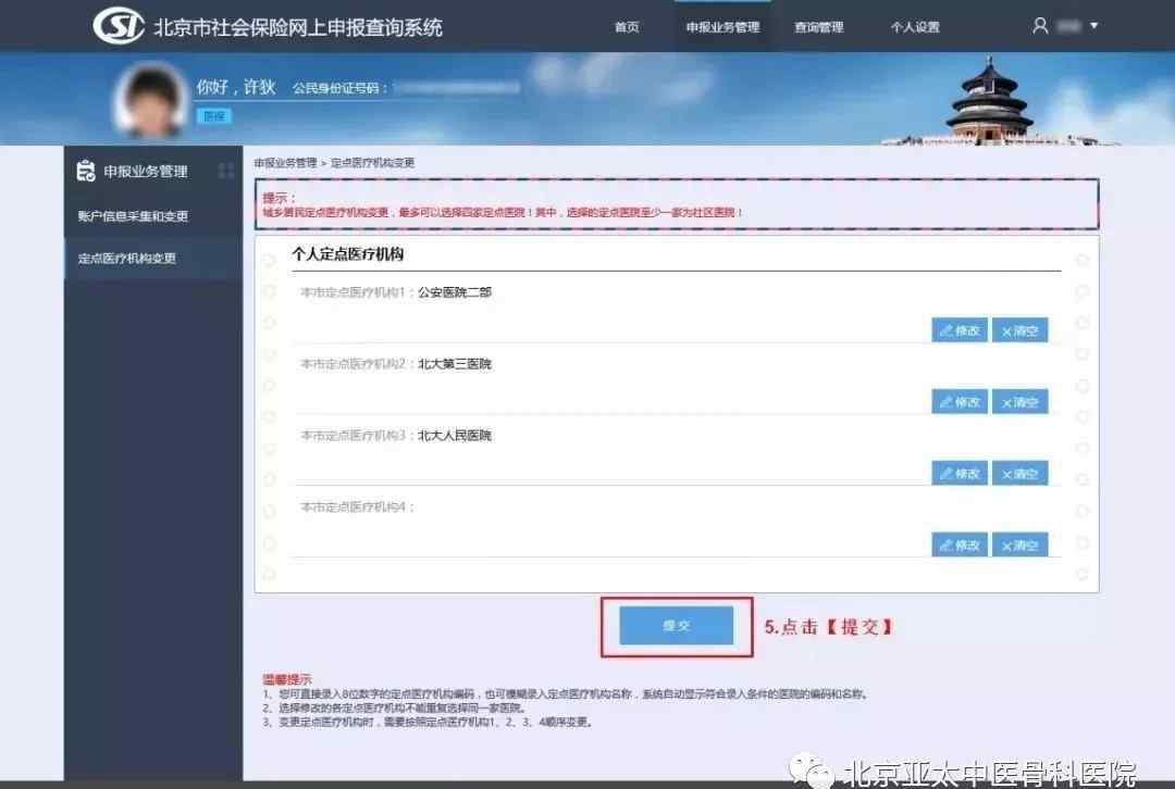 每月5日至月底,每天6时至22时,参加北京市城乡居民基本医疗保险的公民可根据社保机构预留的手机号码登录社会保险在线服务平台,自行修改定点医疗机构。市民可以选择三家医疗机构和一家社区卫生服务站,修改第二天生效。
