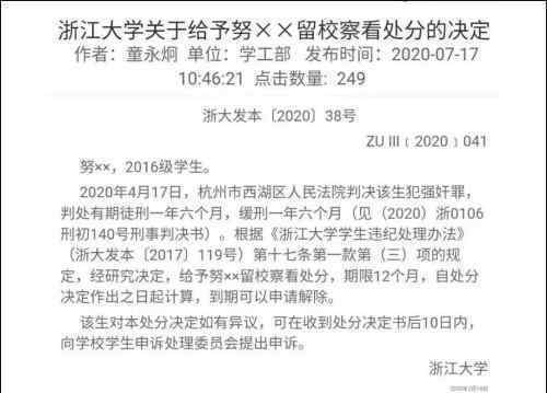 7月20日晚,“浙大给强奸犯学生缓刑”的消息在网上引起轩然大波。根据学校文件,涉案学生Nuxx是浙大2016级学生。今年4月17日被杭州西湖区人民法院以强奸罪名判处有期徒刑一年六个月,缓刑一年六个月。根据《浙江大学学生违纪处分处理办法》第十七条第一款第(三)项规定,经研究,决定对该学生缓刑12个月,从处分决定作出之日起计算,期满可以申请解除。