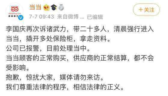 经历了“抢公章”等事件后,关于当当控制权的闹剧还在继续。昨日(7日)上午9时43分,当当网官方微博发布消息称:李国庆再次动用武力,带着20余人,早上强行进入当当网,撬开几个保险柜,取走信息。该公司已经报警,目前正在处理。