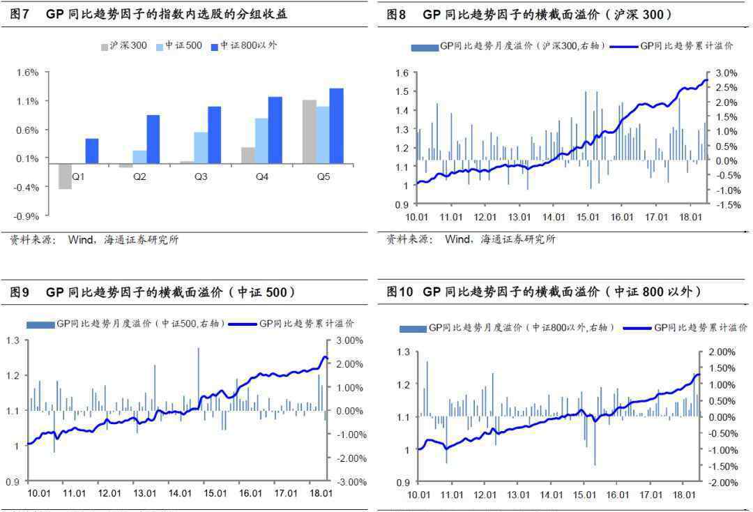 在图7中,GP同比趋势因子的月平均分组收益具有明显的单调性,其中沈虎300最为显著。从横截面溢价的平均值来看,沪深300指数因子的月平均溢价为0.44%,在沪深500和沪深800之外分别为0.22%和0.20%。从横截面保费的月胜率来看,沪深800以外因素的胜率最高,达到74%,而沪深300和沪深500的胜率稍差,分别为65%和67%。