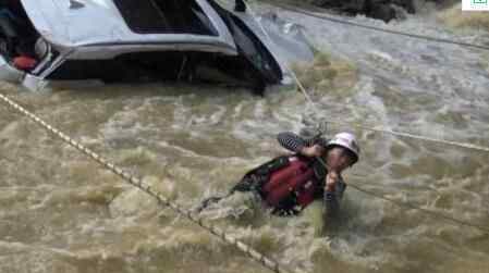 现场消防指挥员立即安排人员在河流两侧搭建绳桥,让一名消防员穿好水域救援服,系好安全绳,携带安全绳、水域救援服、安全帽,采用横渡救援的办法,到达被困车辆处进行救援。