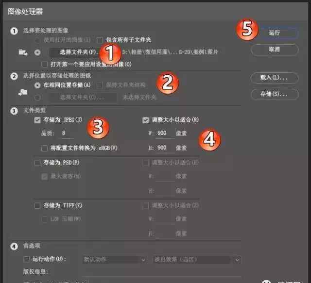 红圈1:点击“选择文件夹”,在弹出的对话框中浏览定位到你的图片所在的文件夹即可。红圈2:建议就直接选择默认的“在相同位置存储”就好,所以就是不用管它,当然你也可以点下面的选项自定义保存位置。红圈3:一般都选择jpg格式,品质设置成8,6也是可以,品质越大最后的体积越大,推荐用双数品质。红圈4:调整大小是关键啦,这里只需你把长款都填写上你希望改后的最长边的那个尺寸,比如案例是希望最长边是900,所以就全部写成了900,这样它会自动判断你的原图是长图还是横图的,我们自己不用操心这个问题。红圈5:点击“运行”,去喝茶,去唠嗑,等结果就好了。PS:白圈4的偏好,“跑步动作”,就是我们常说的预设动作。但是,在改变图片大小的任务中,忽略它,大胆丢弃它。
