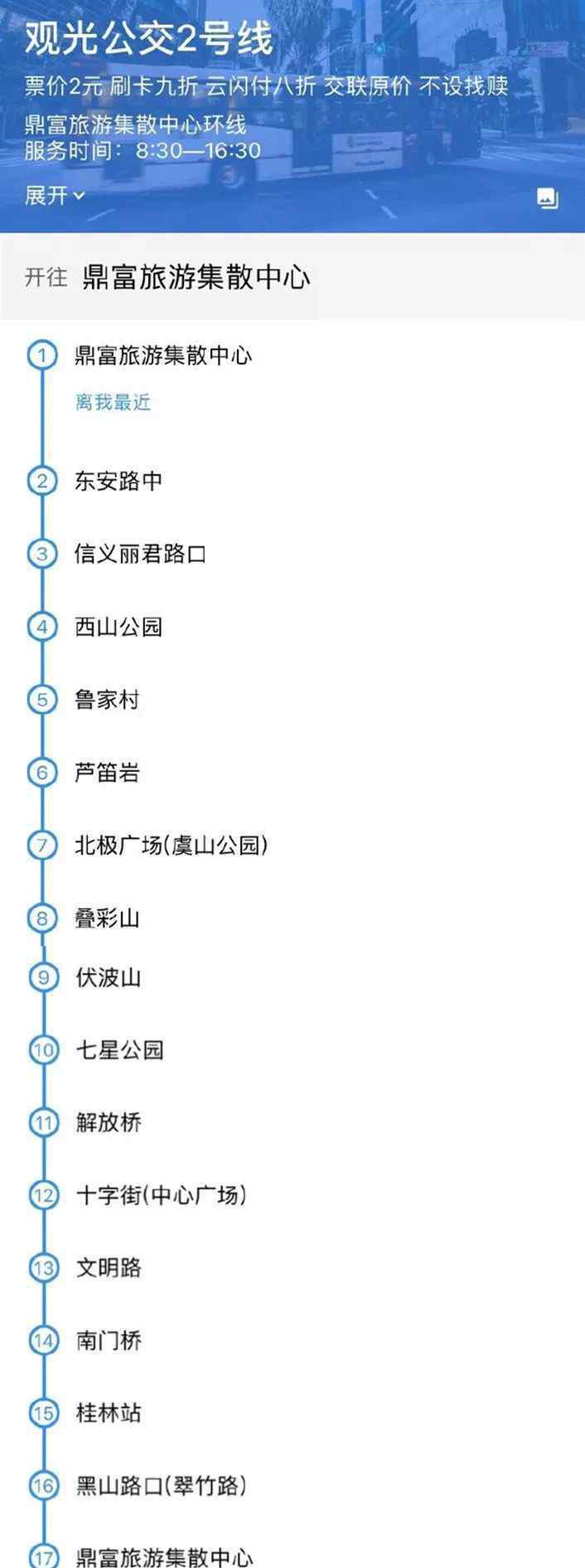 观光巴士2号线从鼎富旅游集散中心出发,经西山公园、陆家村、芦笛岩、北极广场、叠彩山、富博山、七星公园、解放桥、十字街、温明路、桂林火车站返回鼎富旅游集散中心。