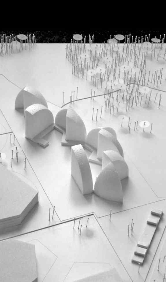 硫酸纸切成不同半径的圆,稍皱,用大头针扎进底座。很简单的方式,硫酸纸略皱的质感搭配光影,为瓦楞纸制成的建筑草模增添了意境。