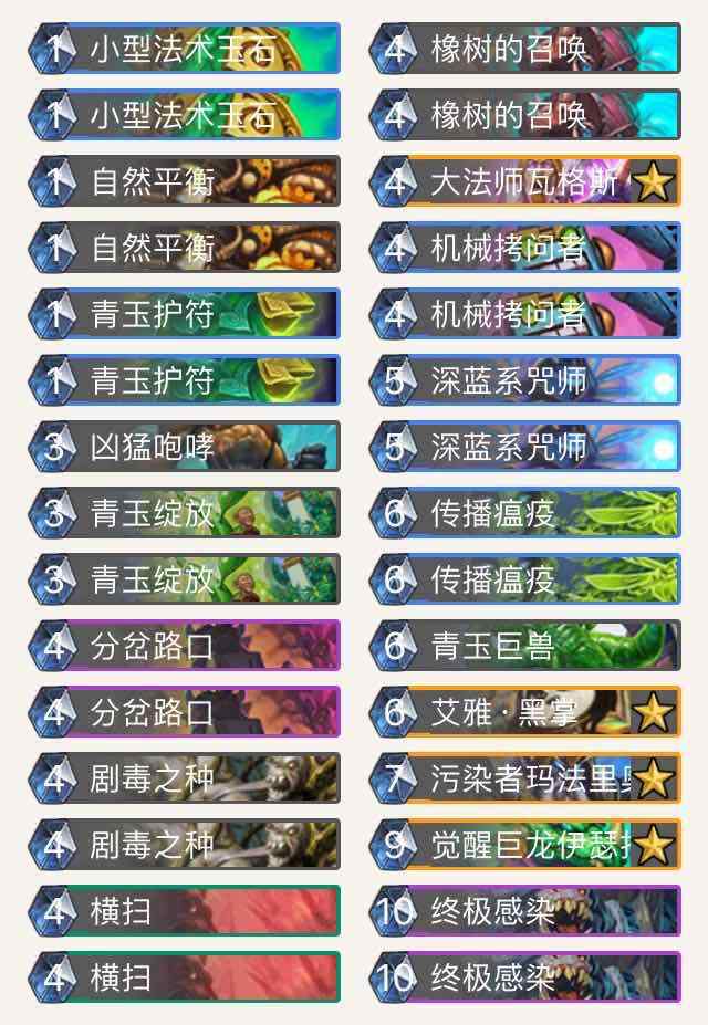 要说青玉,作为炉石流传最广的卡组之一,是在“入龙加奇森”版本中发展起来的。当德鲁伊的跳费卡滋养、狂生等卡牌未斩时,天梯几乎绿如玉,再加上横扫、瘟疫蔓延等领域控牌,以及被誉为10费之最“脚跟”的一张牌——“终极感染”,清育几乎可以解决领域