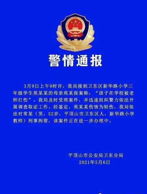 5月7日,平顶山市卫东公安分局发布警情通报,正式公布了此前发生于当地的“老师体罚学生致皮骨分离”事件的处理结果。经鉴定,受到体罚的9岁学生苑某某受到轻伤,构成轻伤二级,为此,涉事教师常某已被警方刑事拘留。尽管此案目前仍在侦办,但人们不难预见——常某必将为其残忍的行为受到法律的惩戒,付出沉重的代价。