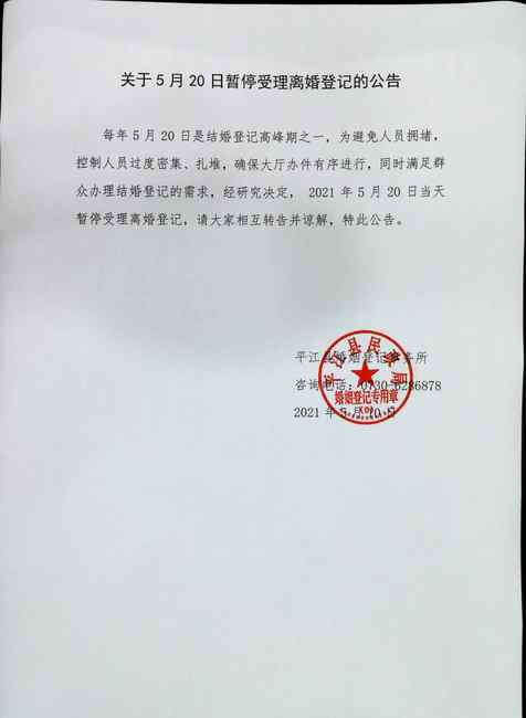 据湖南省岳阳市平江县人民政府:每年5月20日是结婚登记高峰期之一,为避免人员拥堵,控制人员过度密集、扎堆,确保大厅办件有序进行,同时满足群众办理结婚登记的需求,经研究决定,2021年5月20日当天停受理离婚登记告。