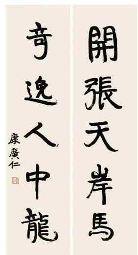 康楷书七言联。6岁时,康不喜欢发帖和学习,受到父亲和哥哥的责备,所以他推荐自己当儿童教师。父亲以为他在玩,所以想试试他。文师从,所以他家招收了八九个孩子做徒弟。我看康上课很认真,自创规矩,让调皮傲慢的孩子听话。别人相信他有办事能力!