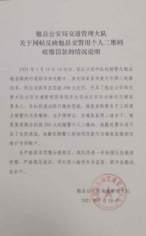 5月19日10时许,江南中队民辅警在勉县勉温路进行道路巡查执勤中,查处谢某某驾驶无号牌二轮摩托车,依法对其作出罚款200元处罚,开具了勉县公安局交管大队公安交通管理简易程序处罚决定书并当场送交谢某某本人,告知其通过银行缴纳罚款,谢某某称要急于上班请求辅警代为其缴纳,为方便群众,在谢某某再三请求下,谢某某用微信转款200元到辅警个人二维码,执勤民警当场开具了处罚票据,执勤民辅警已将该项罚款代为谢某某缴纳至银行专用账户。