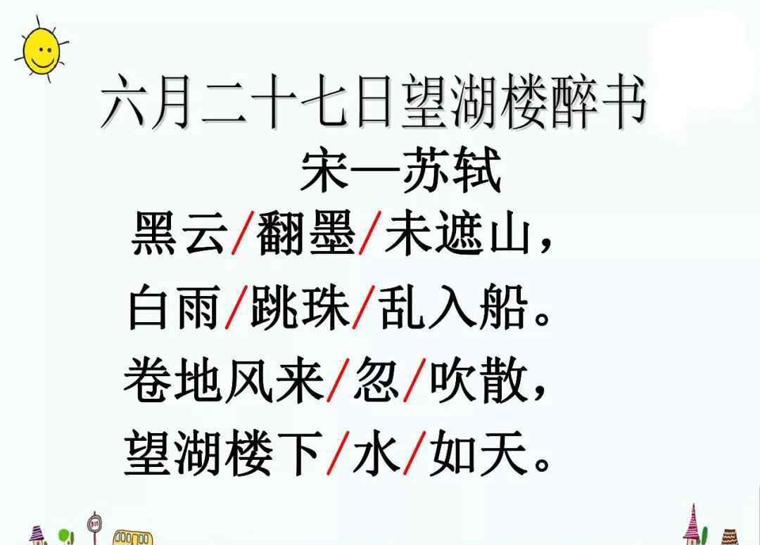 2.《六月二十七日王虎楼醉书》这首诗描述了夏天的场景。描述的风景包括乌云、雨、风和湖水。它表达了诗人对自然的热爱。