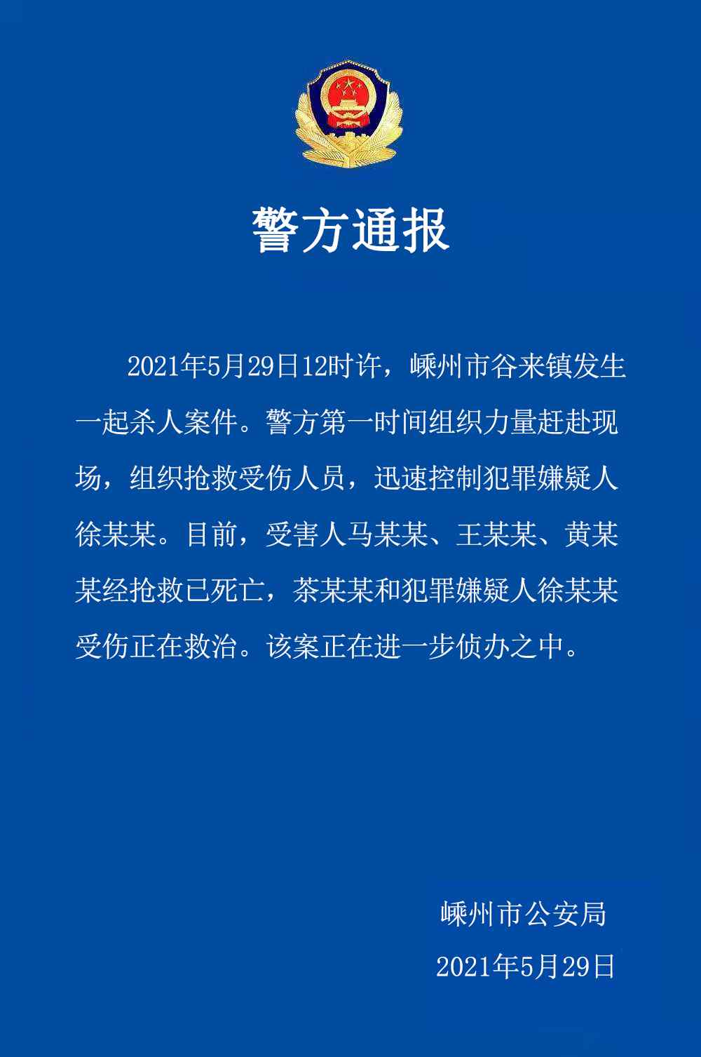 2021年5月29日12时许,嵊州市谷来镇发生一起杀人案件。警方第一时间组织力量赶赴现场,组织抢救受伤人员,迅速控制犯罪嫌疑人徐某某。目前,受害人马某某、王某某、黄某某经抢救已死亡,茶某某和犯罪嫌疑人徐某某受伤正在救治。该案正在进一步侦办之中。