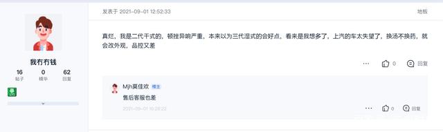 更有网友表示:真烂,我是二代干式的,顿挫异响严重,本来以为三代湿式的会好点,看来是我多想了,上汽的车太失望了,换汤不换药,就会改外观,品控又差。