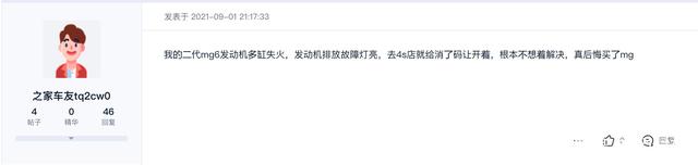 还有网友表示:我的二代MG6发动机多缸失火,发动机故障灯亮,去4S店就给消了码让开着,根本不想着解决,真后悔买了MG。