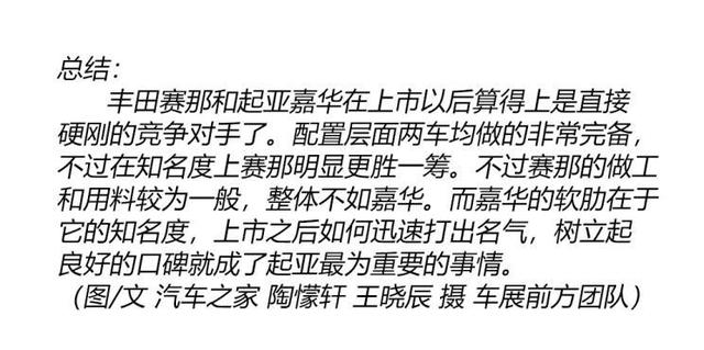 总结:对于全家出行这个诉求,两款车自然能够很好的胜任。赛那(参数|询价)和嘉华的优劣势其实非常明显,赛那的名气自然更大,但是做工用料一般,而上市之后的加价问题也是大家心有余悸的。嘉华的知名度不如赛那,但整体的做工,用料则都要更好。在开放三胎的今天,MPV已经变得越来越重要,未来它俩能否平分秋色,还要看看最终的定价如何了。