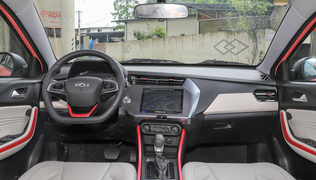 进入车内,瑞虎3x内饰采用家族式环保座舱设计,黑色的中控台与白色的座椅形成对比冲击,高级感十分突出,大面积镀铬饰件以及粉红色饰条的点缀也提升了精致感,同时仿碳纤维纹路的装饰配合平底三幅式方向盘,进一步营造出年轻运动的氛围。而向驾驶位倾斜的9英寸中控大屏搭配下方的实体空调设置按键,兼顾实用性和便捷性,并支持蓝牙电话、语音识别控制以及CarPlay/CarLife互联等时下主流功能,满足了年轻群体对科技感的诉求。