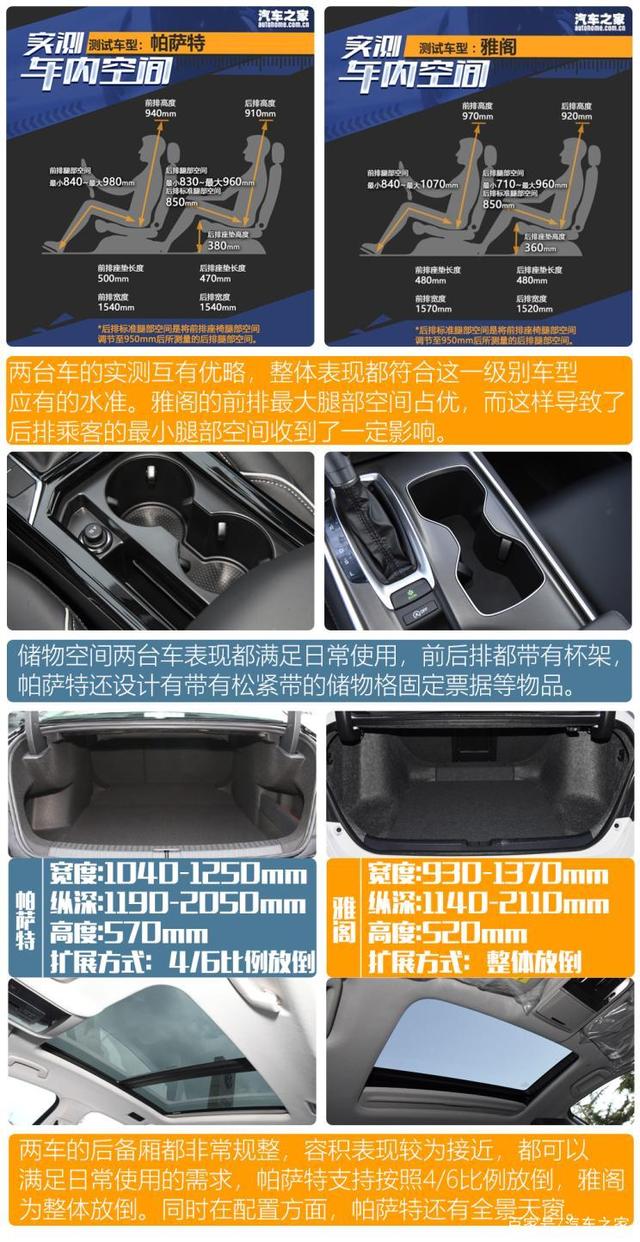 空间部分两台车尺较为接近,所表现出来的乘坐及后备厢容积也基本处在同一水平,相比之下帕萨特的优势主要体现在提供了全景天窗,对于车内采光表现更突出一些。