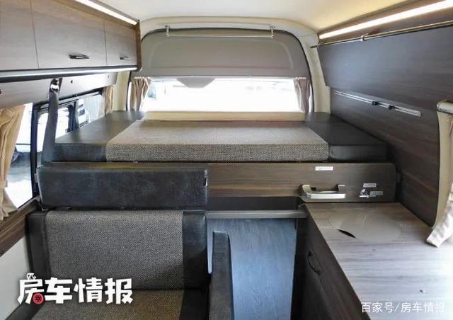 从车身左侧进入车厢内部,在主驾驶后方提供了一排双人乘客座椅,前方还匹配了一张可移动的餐桌,平时驻车时两个人坐在这里吃饭或者聊天,空间上都是可以满足的,而且沙发座椅采用了亲肤材质,还带有扶手,非常像家里的沙发,这样的设计从而提升了整体的乘坐舒适度。