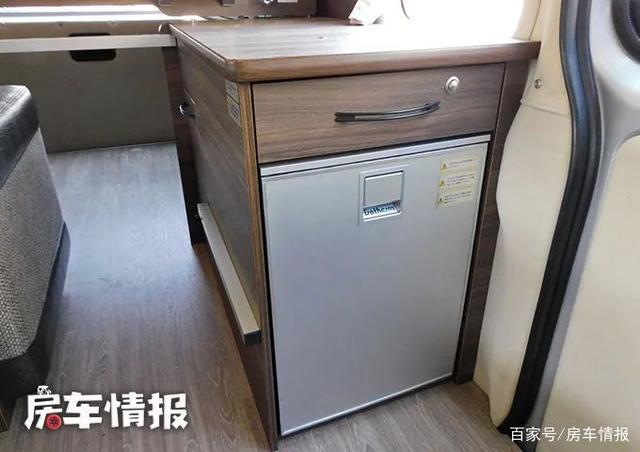 在乘客门后方设立了一个小型的厨房操作台,台面上隐藏了一个带有盖板的不锈钢水槽,后期也可加装其他的家用小电器,侧面还配备了一台49L的车载冰箱,存放两个人的食物也还够用,顶部还提供了一台19英寸的三菱电视,也能满足旅行出游的基本娱乐需求。