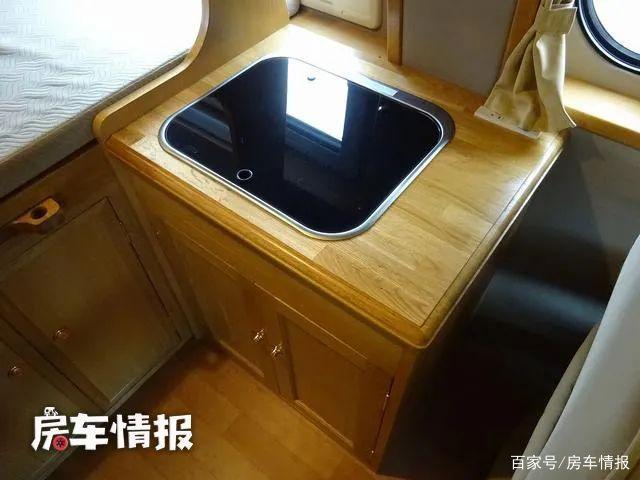 单人沙发后方是全车的厨房操作台,台面上提供带盖的不锈钢水盆,平时可以简单的冲洗瓜果蔬菜,后期结合卡式炉,也可以满足简单的烹饪需求。