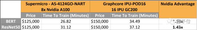 在BERT和ResNet50训练中,英伟达A100的速度分别是IPU的1.54倍和1.43倍。