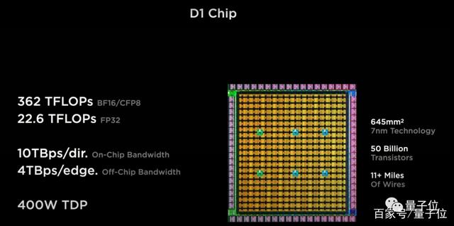 作为特斯拉首款AI训练芯片,D1芯片采用分布式结构和7nm工艺,搭载500亿个晶体管、354个训练节点,实现了超高算力和超高带宽。