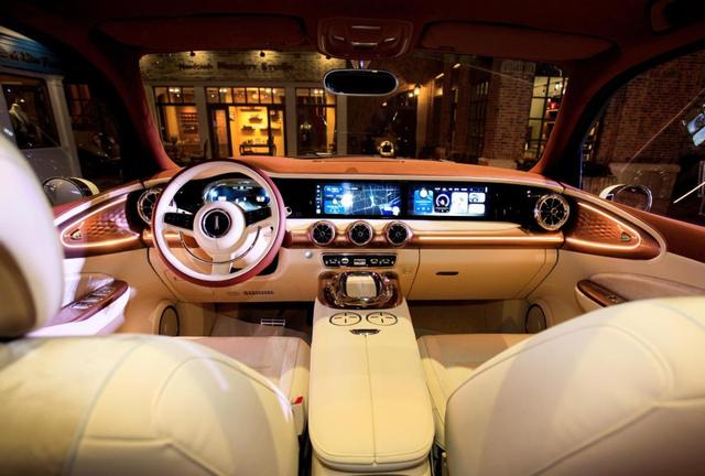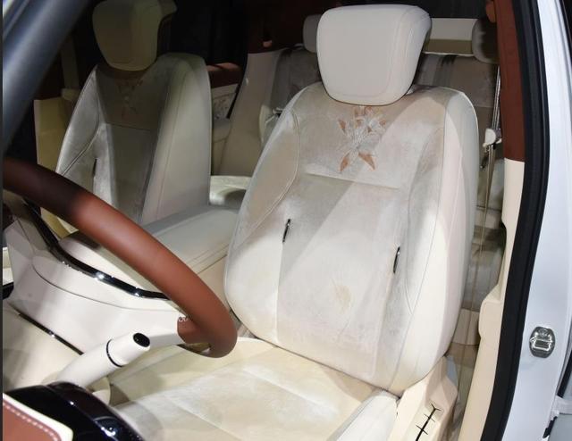 现代科技与复古风格碰撞出独特的火花,设计师们让这台复古潮驾的内饰达到了对立统一的效果。我们都知道汽车是舶来品,所以早期汽车都带有明显的欧洲风格,这台复古潮驾在内饰细节上很多地方都有体现,比如配色选择,圆形出风口以及双色的方向盘造型。中控台下夸张的三联屏瞬间把人拉回到摩登时代,由全液晶仪表盘、中控大屏和副驾驶座椅前方的娱乐屏组成。除此之外,这款车还融入了中国传统文化理念,翻毛质感的座椅表面加入了刺绣工艺,增强了豪华感,但是后续量产车中此配置应该是高配甚至顶配车型才有的配置。