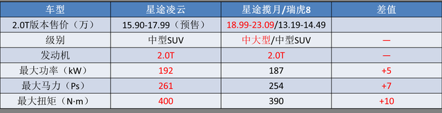值得一提的是,星途凌云400T的2.0T是升级的产品,它的数据比奇瑞/星途目前在售的所有2.0T车型都要强,包括它的大哥星途揽月,最大马力261Ps,峰值扭矩400Nm,这个数据已经可以媲美本田冠道的2.0T(272Ps/ 370Nm)。