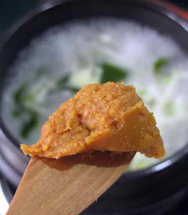 6 取适量味噌酱倒入锅内,煮5分钟左右。