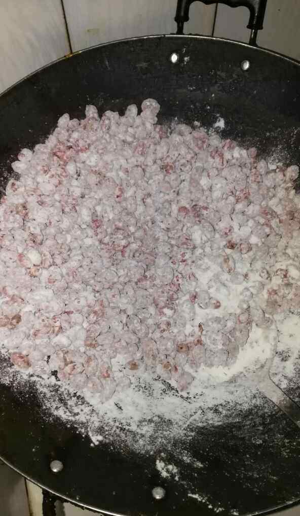 3 花生米炒至表皮能去掉带微黄盛出待凉